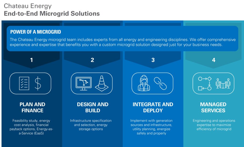 Chateau Energy will provide oversight and expertise to help plan, finance, design, build, integrate, deploy, and maintain a microgrid project. Our end-to-end Microgrid solution includes: