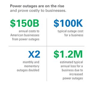 Power to run an organization is necessary, but an uninterrupted power source is vital to the success of any organization. A power interruption can cause costly damage to equipment, stop production, increase safety concerns, jeopardize patient care, raise security risks, and ultimately have a huge negative financial impact. The U.S. Department of Energy estimates power outages are costing American businesses around $150 billion per year. A microgrid allows organizations a way to combat power outages and ease the impact of costly and harmful downtime.
