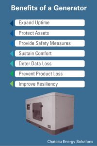 Power loss can damage equipment, productivity, and product. It can also endanger safety and millions in revenue. A generator prepares an organization for an inevitable power outage and provides a power supply to keep your business running. Chateau Energy Solutions can help determine what type of generator best fits your needs, deploy the generator, and provide financing if needed.